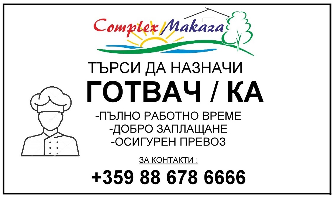 Ресторант „Флора“ търси готвач с опит. Изисквания: Опит,, отговорност, сериозност и лоялност. На пълно работно време. Възнаграждение: 1000 лв +