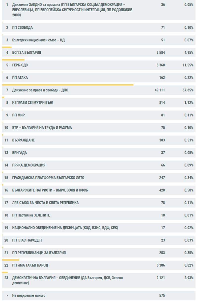 ГЕРБ заема второто място с 11.55% и 8 360 гласа. „Има такъв народ“ е на трето място с 8.82% и 6 386 гласа.