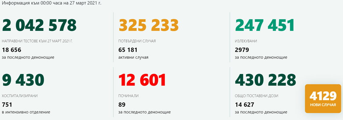 Общият брой на потвърдените случаи става 325 233, от които активни са 65 181.